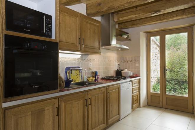 Cuisine : four et plaques de cuisson au gaz propane, micro-ondes, lave-vaisselle, grand frigo-congélateur, très nombreux rangements. Eléments en chêne massif.